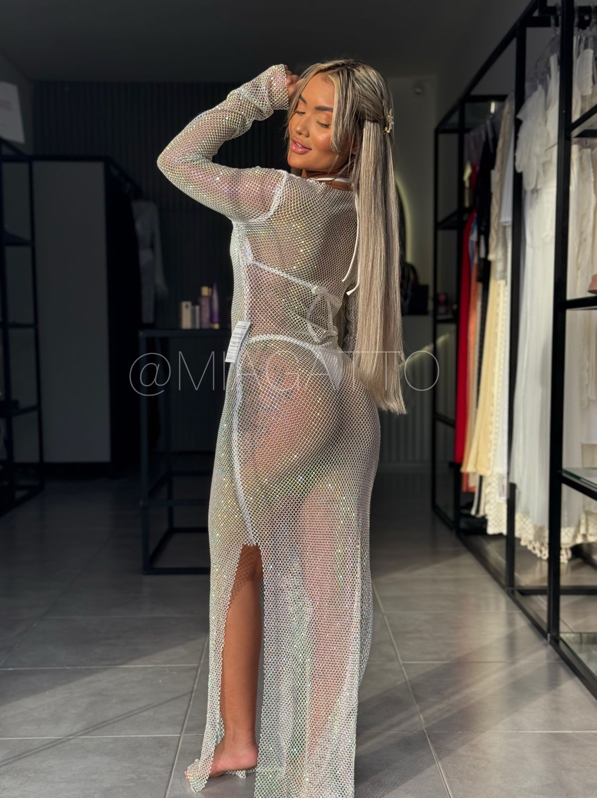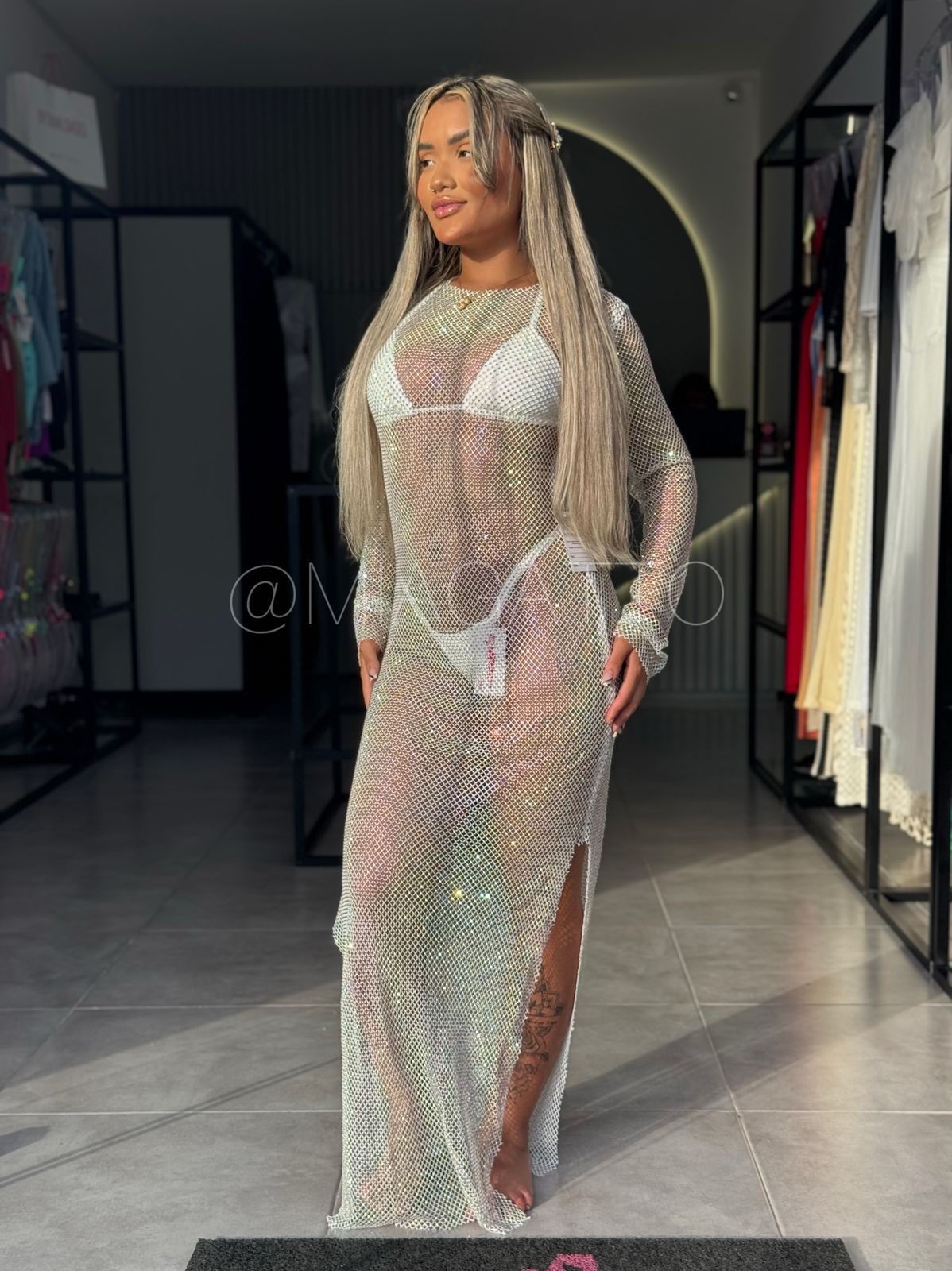 DESCRIÇÃO DO PRODUTOUm look cheio de atitude e glamour! O conjunto transparente com brilhos e plumas nos punhos e barra é puro luxo e estilo. O biquíni branco por baixo...